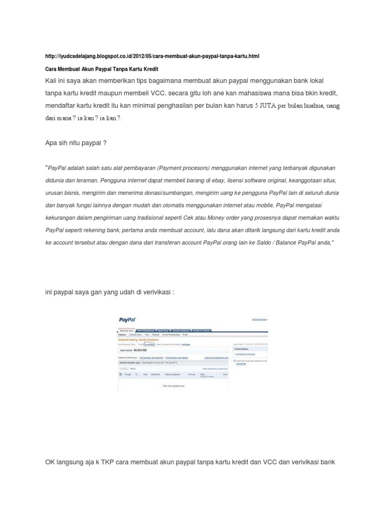 Cara membuat akun paypal pribadi dengan mudah dan cepat tanpa kartu kredit. Sekian tutorial cara verifikasi paypal 2017 tanpa kartu kredit, semoga bermanfaat. Berikut adalah cara menghapus kartu kredit: #paypaltanpakartukredit tutorial cara membuat akun paypal mudah tanpa kartu kredit dan vcc, nah buat temen2 yang blm memiliki kartu kredit. Ini adalah cara untuk membuat paypal tanpa menggunakan kartu kredit (mastercard, visa baiklah, kita akan masuk ke tutorial bagaimana cara membuat paypal gratis tanpa kartu kredit.